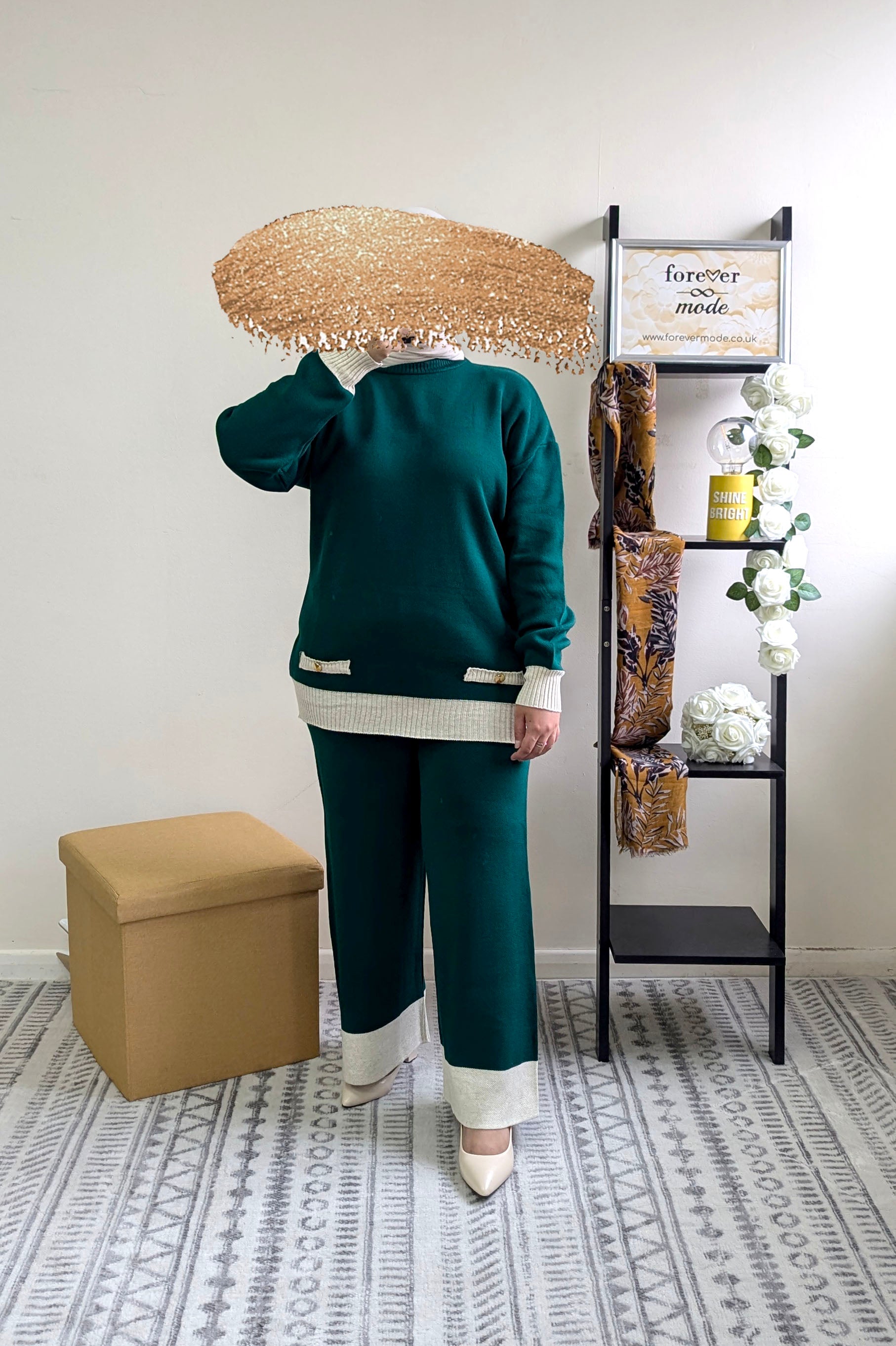 Crafted with a high-quality knit, this co-ord set is the epitome of modern elegance. Its flawless contrasting design offers a sleek and sophisticated look, perfect for any occasion. Made with the highest attention to detail, it ensures a comfortable and flattering fit for all. Elevate your style with this warm knit co-ord with button details.